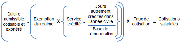 Règle pour calculer les cotisations | Établir le montant de cotisations à créditer au participant par rapport au salaire admissible cotisable et exonéré et au service cotisable et exonéré pour l'année. Note : La méthode suivante sert à calculer les cotisations salariales qui sont reconnues au participant, qu’elles soient versées ou exonérées. Ainsi, les cotisations que doit verser un participant se calculent sur le salaire admissible cotisable et les cotisations dont il est exonéré se calculent sur le salaire admissible exonéré. | ||||||||||||||||||