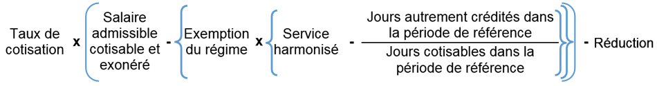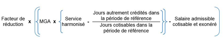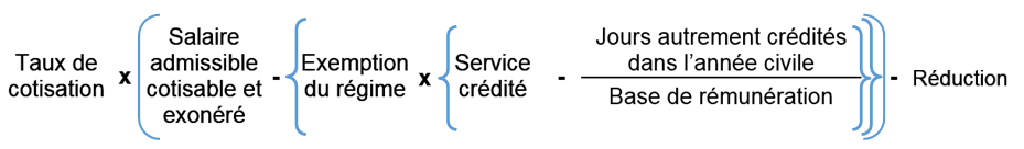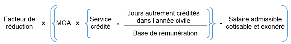 Depuis le 1er janvier 2012 L'application de la réduction dans la formule de cotisation permet d'éviter d'augmenter les cotisations des participants dont le salaire admissible cotisable et exonéré est inférieur au MGA multiplié par le service crédité ou harmonisé (excluant les jours autrement crédités). Ainsi, les cotisations versées par ces participants avec la nouvelle formule de cotisation sont comparables à celles qu'ils verseraient si l'exemption du régime de 35 % du MGA était maintenue. Note : La réduction crée un manque à gagner dans le fonds des cotisations salariales qui est compensé par le gouvernement. La réduction correspond au montant le plus élevé entre :