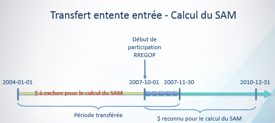 Particularité | Salaire admissible pour le participant qui a bénéficié d'un transfert entente entrée Depuis le 1er janvier 1991 S'il y a eu un transfert d'années de service créditées sur une base d'équivalence des valeurs actuarielles des prestations, les salaires des années de service créditées dans le régime de départ, ainsi que les salaires des années acquises dans le régime d'arrivée avant les années visées par le transfert, sont exclus du calcul du salaire admissible moyen. Ainsi, les salaires relatifs aux années de service postérieures aux années visées par le transfert et le salaire reconnu dans une année qui chevauche la dernière année de la période transférée doivent être inclus dans le calcul du salaire admissible moyen. (Réf. : 22121N) Exemple Un participant effectue un transfert entente entrée sur base d'équivalence des valeurs actuarielles au RREGOP pour la période du 1er janvier 2004 au 30 novembre 2007. Il occupe un emploi visé par le RREGOP depuis le 1er octobre 2007. Le salaire reconnu au RREGOP pour la période du 1er octobre au 30 novembre 2007 doit être utilisé pour le calcul du salaire admissible moyen, puisqu'il n'est pas relatif à une année antérieure à une année transférée.