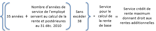 | La somme de la rente viagère pour service crédit de rente, de la rente temporaire pour service crédit de rente et des crédits de rente ne peut pas excéder la rente de base que le service crédit de rente aurait valu s'il avait compté pour le calcul de la rente de base (service à 2 %). Ainsi, les rentes additionnelles sont limitées. La rente viagère pour service crédit de rente est limitée au montant le moins élevé de :